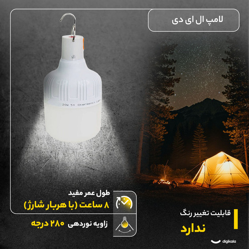 چراغ آویز ال ای دی شارژی مدل 40W که دارای 24 عدد چراغ LED کم مصرف بوده و قابلیت روشنایی طولانی مدت 8 ساعت را دارا است. این محصول شگفتانگیز 3 حالت مختلف روشنایی دارد که شامل حالت ثابت پر نور و ثابت کم نور و حالت چشمک زن یا رقص نور بوده و با وجود توان بالای خروجی، کم مصرف است. از ویژگیهای بسیار مهم این لامپ شارژی، میتوان به قابلیت حمل و نقل بسیار آسان آن به دلیل داشتن وزن کم و عمر بالای باتری آن اشاره کرد. در قسمت بالای این محصول، یک قلاب تعبیه شده است تا به آسانی به مکان دلخواهتان نصب شود. این محصول فوق العاده با روشن بودن مداوم اصلا گرم نمیشود و در زمان قطعی برق، بسیار کاربردی عمل میکند. در مواقع نیاز میتوانید این چراغ را به راحتی از طریق پاوربانک و یا شارژر دیواری شارژ کرده و حتی آن را از طریق شارژر فندکی ماشین نیز شارژ کنید و در همه حال به آسانی از آن استفاده کنید. داشتن نور کافی و عمر بالای آن در مواقع ضروری که دسترسی به برق ندارید این وسیله را به ابزاری مفید و ضروری برای شما تبدیل میکند.